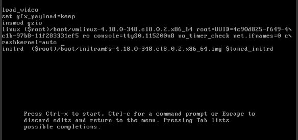 - 부팅 화면 확인시 Grub 모드 선택시(커널 선택시) 'e' 키를 눌루서 부팅 편집기에 들어간다.