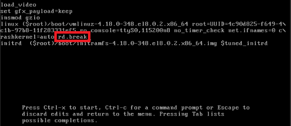 - 부팅 화면 확인시 Grub 모드 선택시(커널 선택시) 'e' 키를 눌루서 부팅 편집기에 들어간다.