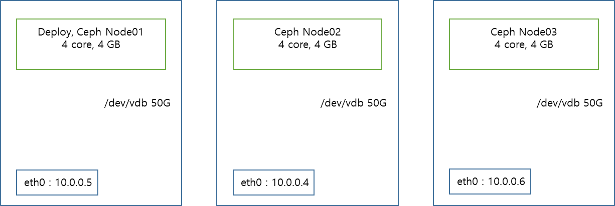 | $ sudo useradd -d /home/cephdeploy -m cephdeploy $ sudo passwd cephdeploy 암호 임력 : test123 $ echo "cephdeploy ALL = (root) NOPASSWD:ALL" | sudo tee /etc/sudoers.d/cephdeploy $ sudo chmod 0440 /etc/sudoers.d/cephdeploy |