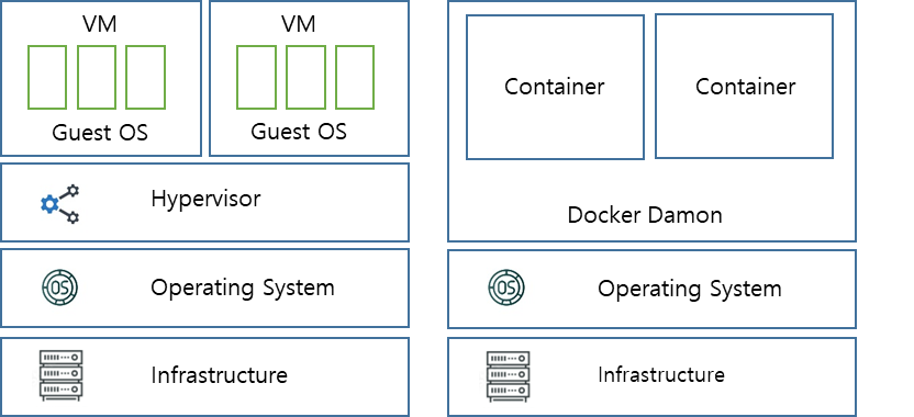 - 가상머신은 기존 서버에 하이퍼바이저 설치와 그 위에 가상 OS와 App을 설치하여 서비스를 수행하는 방식